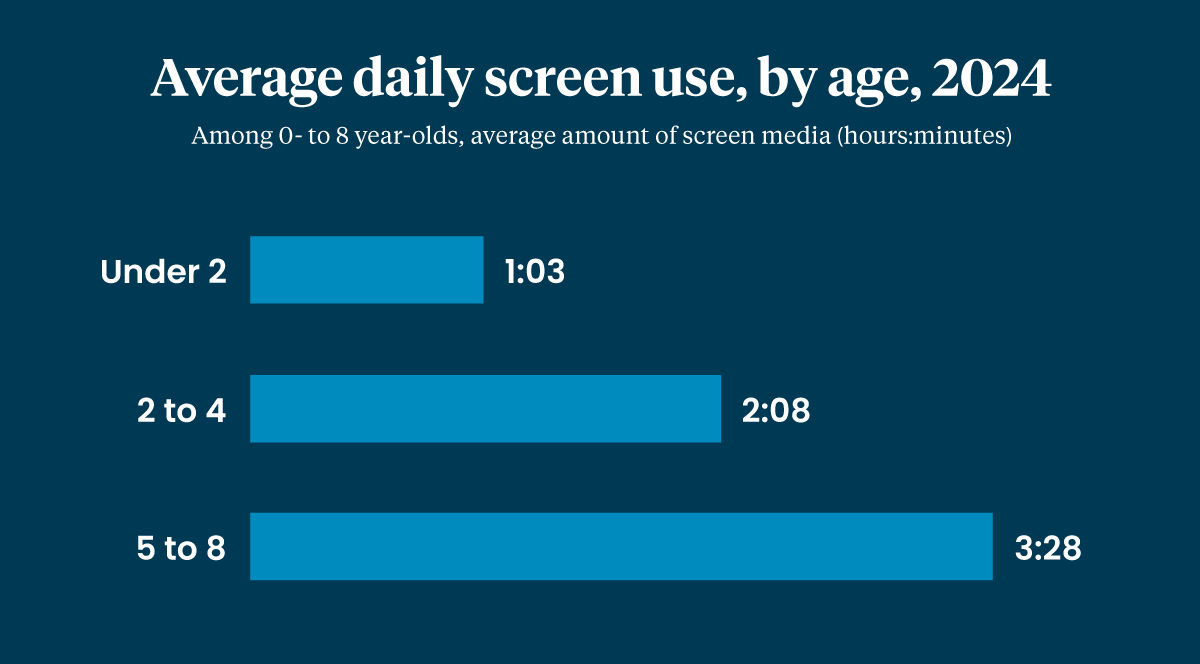 Common Sense Media, an education nonprofit focused on children’s technology and media use, found in 2024 that children under age 2 were getting an average of 1:03 hours of daily screen time, with more than half of that time spent watching television or videos. By age 2, the group found, 40% of children had their own tablet.