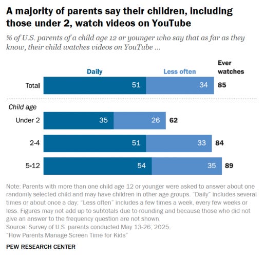 Another 62% of the same population said their child ever watches videos on YouTube, while 35% said their infants and toddlers watch it every day.